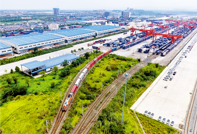 今年以来,有关部门在坚决打赢疫情防控阻击战的同时,积极落实各项政策措施,帮助外贸企业保订单、保市场,推动重大外资项目加快落地,保障中欧班列战略通道稳定运行。图为2020年8月5日,一辆满载防疫物资和百货商品的中欧班列从成都国际铁路港发出,开往德国杜伊斯堡(无人机照片)。 新华社记者 刘坤/摄