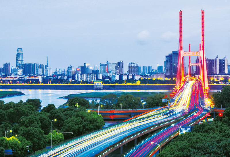 近年来,江西沿着习近平总书记指引的方向和道路砥砺前行,明确把推进江西高质量跨越式发展作为首要战略,发展的成色更纯、底色更亮、根基更牢。图为2020年5月22日,江西省南昌市的地标建筑——八一大桥。 人民图片 徐国亮/摄