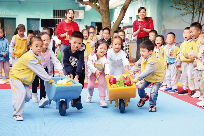 江西坚持以人民为中心的发展思想,加快教育、文化、卫生、体育等社会事业发展,更好满足人民美好生活需要。图为2020年10月14日,江西省峡江县幼儿园通过参加搬运瓜果、冬瓜举重等趣味比赛,提高孩子们热爱劳动、爱惜粮食的意识。 人民图片 陈福平/摄