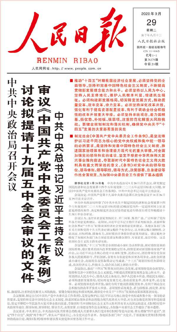 2020年9月28日,中共中央政治局会议审议通过《中国共产党中央委员会工作条例》。