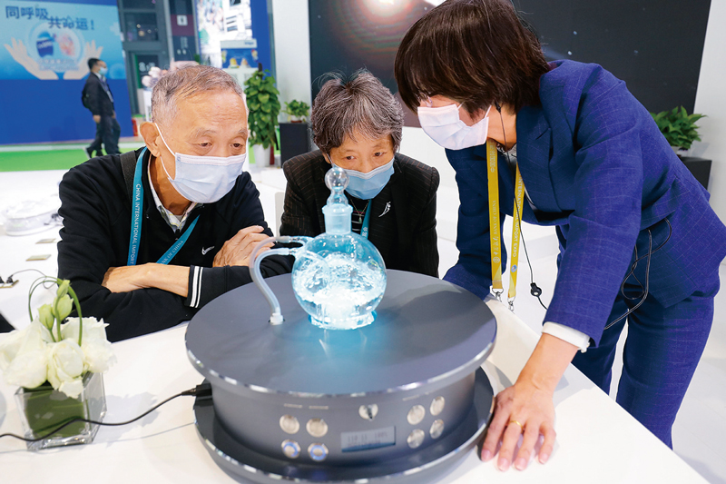 第三届中国国际进口博览会首设公共卫生防疫专区,通过展示国际先进公共卫生防疫产品与技术,为国际抗疫合作搭建交流合作平台。图为2020年11月7日,参观者在了解第三届进博会上全球首发的单线态氢氧呼吸设备。该设备基于德国自然疗法的单线态氧应用技术,模拟自然界的光合作用,应用生物光子能量,帮助人体提高免疫力和抗病毒能力。 中新社记者 殷立勤/摄