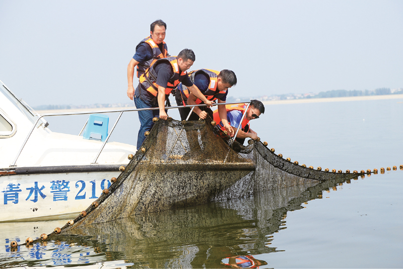 长江十年禁渔计划从2020年1月1日0时起开始实施。江西省共青城公安局启动“长江流域非法捕捞首轮同步巡查执法行动”,严厉打击非法捕捞违法犯罪行为。图为2020年8月25日,共青城公安局民警对新发现的非法捕捞“迷魂阵”进行处理。 公安部供图