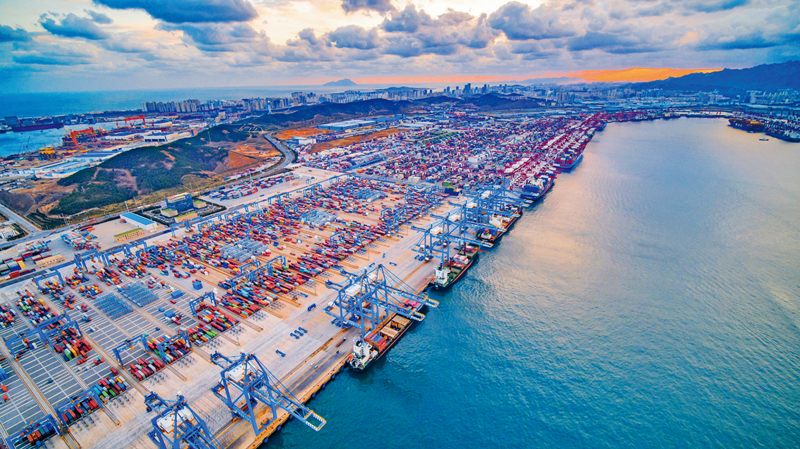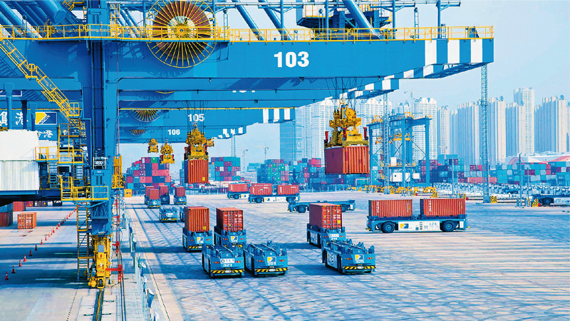 我国完全自主创新并设计建设的亚洲首个、全球领先的全自动化码头——山东港口青岛港自动化码头,在全球首开低成本、短周期、全智能、高效率、更安全、零排放的自动化码头之先河,单机效率比国外自动化码头高出50%。图为山东港口青岛港自动化码头繁忙作业场景。 山东港口集团供图