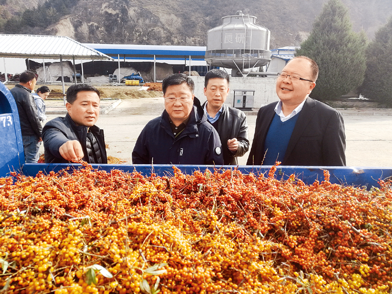 产业找得准,增收步子稳。在发展“牛产业”的同时,邱军的目光被华池一座座荒山所吸引。一次下乡途中,他偶然发现了山沟里零星生长的沙棘。这是一种干旱地区常见的植物,经过加工能变成味美甘甜的沙棘饮料。但是,野生沙棘果实个头小、稀稀疏疏成不了气候。“沉睡”的沟坡,耐旱的沙棘,眼前一亮的邱军做起了沙棘产业的文章。