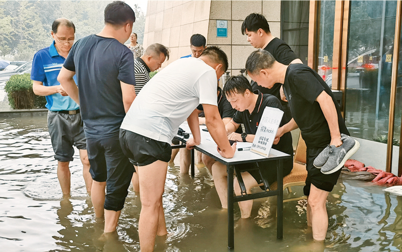 图为2021年7月22日,河南安阳遭遇水灾,中国人民保险理赔人员在临时搭建的理赔点开展理赔。 中国人民保险集团供图