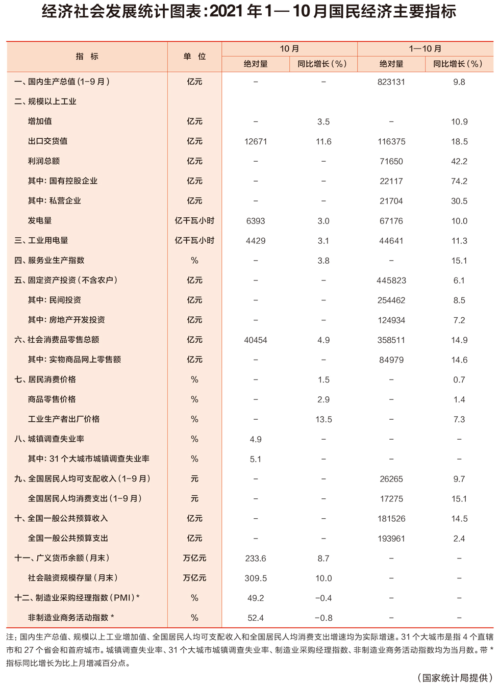 经济社会发展统计图表:2021年1—10月国民经济主要指标