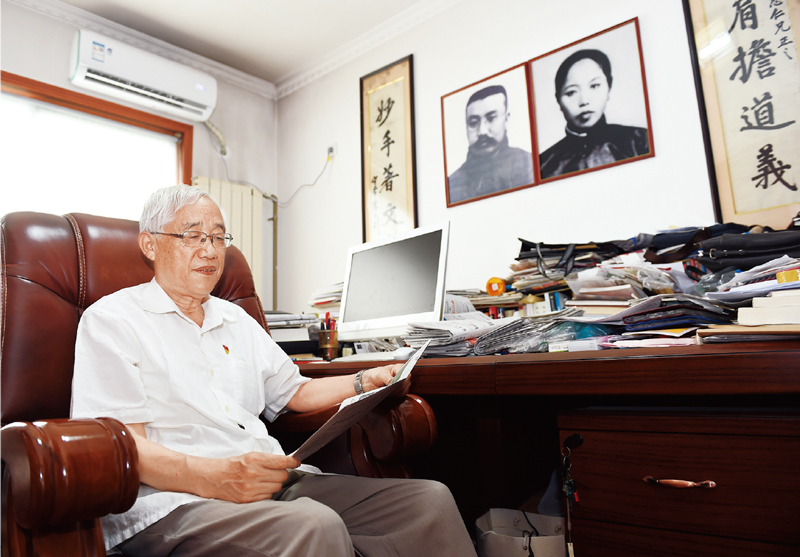 图为2021年6月12日,李宏塔在家中书房读报。 新华社记者 周牧/摄