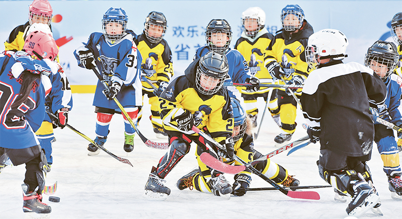 图为河北首届冰雪运动会上,孩子们在配备先进制冷设备的真冰场上进行冰球比赛。 河北日报社 赵海江/摄