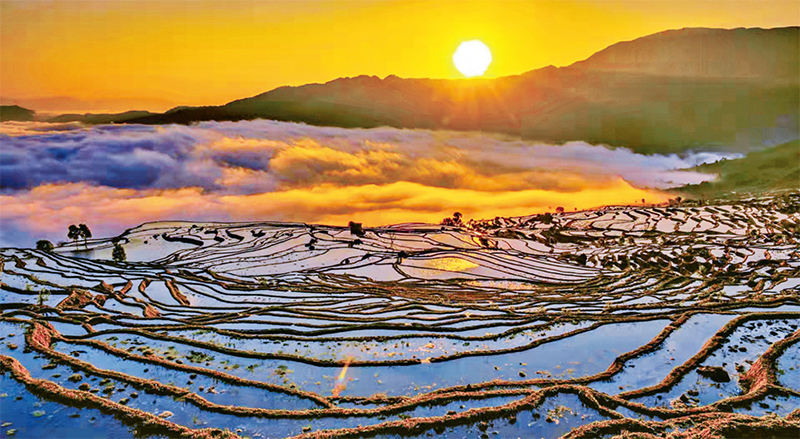 2022年2月13日,阳光洒在梯田上,倒映出田间迷人的画卷,犹如人间仙境。图为红河县宝华镇至甲寅镇沿途杨柳梯田风光。 红河州委宣传部供图 陆光汉/摄