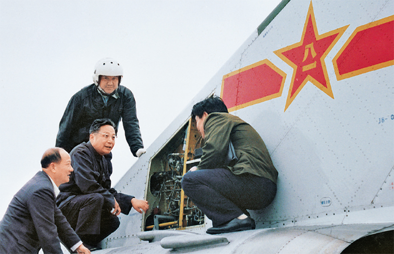 图为顾诵芬(左二)和科技人员在机上研究技术问题(资料照片)。 新华社发 航空工业沈飞供图