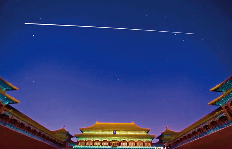10年来,国家经济实力、科技实力、综合国力跃上新台阶。图为2021年11月19日,在北京故宫午门拍摄的中国空间站过境照片(轨迹为多张照片堆栈)。 新华社记者 邢广利/摄