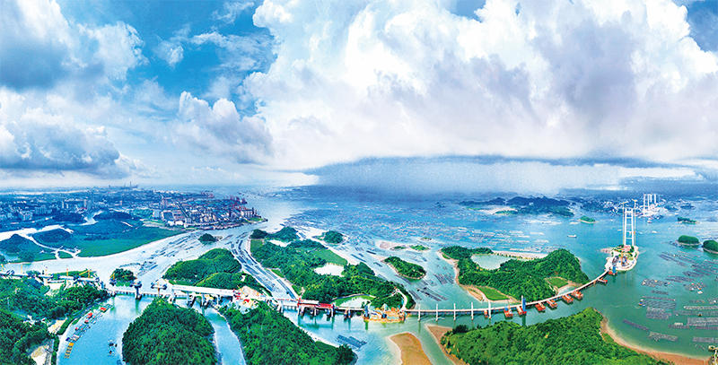 2022年7月29日,广西最长跨海大桥——龙门大桥正如火如荼施工建设中。该项目全长7.6公里,建成后将大大缩减防城港与钦州港的时空距离,有力促进北海、钦州、防城港一体化进程,推动北部湾经济区高质量发展,助力西部陆海新通道建设。 广西日报供图 周军/摄