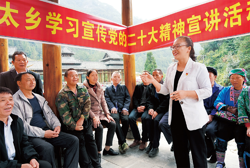 2022年11月5日,在广西柳州融水苗族自治县安太乡培秀村,宣讲员正在向苗族群众宣讲党的二十大精神。连日来,该县新时代文明实践中心宣讲队深入苗家侗寨,以多种形式宣讲党的二十大精神,让党的声音传遍千家万户。 广西日报供图 龙涛/摄