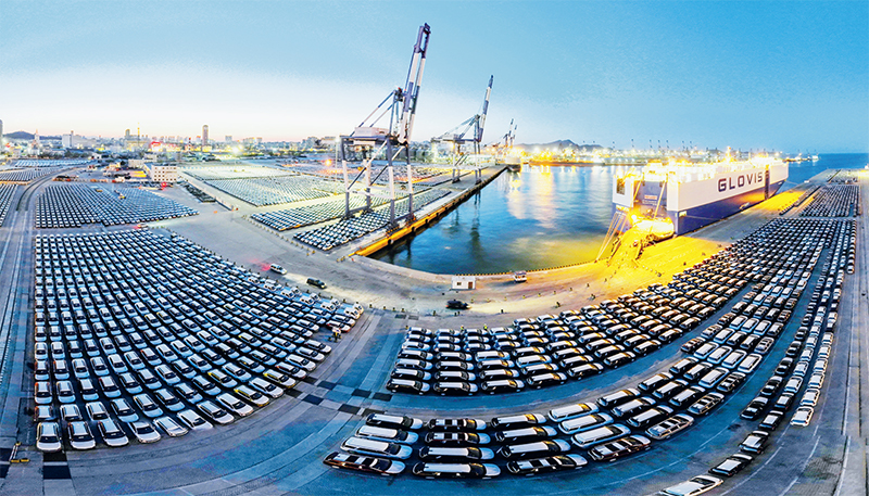 我国坚定不移扩大对外开放,货物进出口总额连续多年居世界首位。图为2023年4月8日,在烟台港滚装码头,大批外贸商品车等候发运。 中经视觉 宋林继/摄
