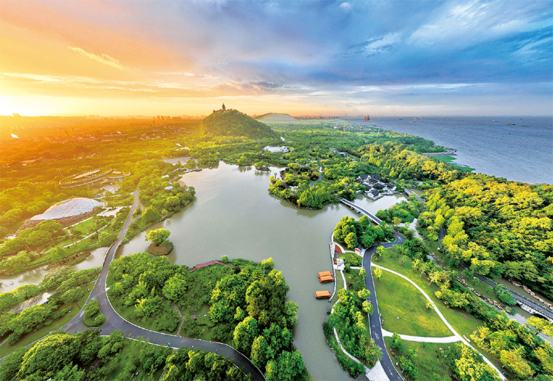 图为2022年7月,江苏省南通市五山地区滨江片区山水相依,草木葱茏,风光旖旎。 南通市委宣传部供图