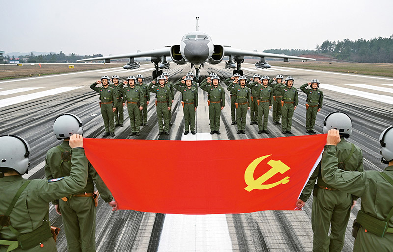 图为2023年2月18日,空军航空兵某团飞行二大队组织飞行人员向党旗宣誓。 新华社发 余红春/摄