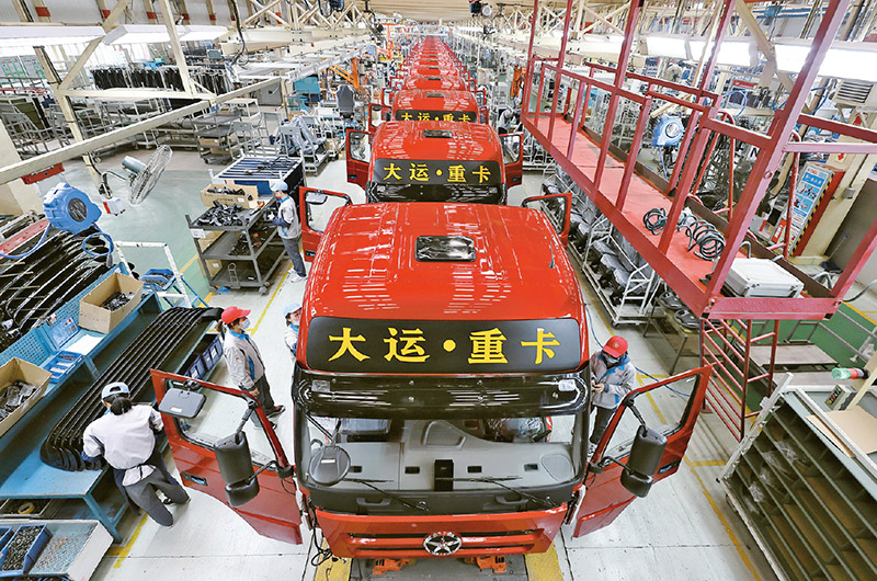 近年来,山西大力实施产业链“链长制”建设,着力构建以制造业为重点的现代化产业体系。2022年,山西新能源汽车、高端装备制造等十大重点产业链带动上下游经营主体2200多户,营收总额突破3800亿元。图为大运重卡总装车间。 山西日报社供图
