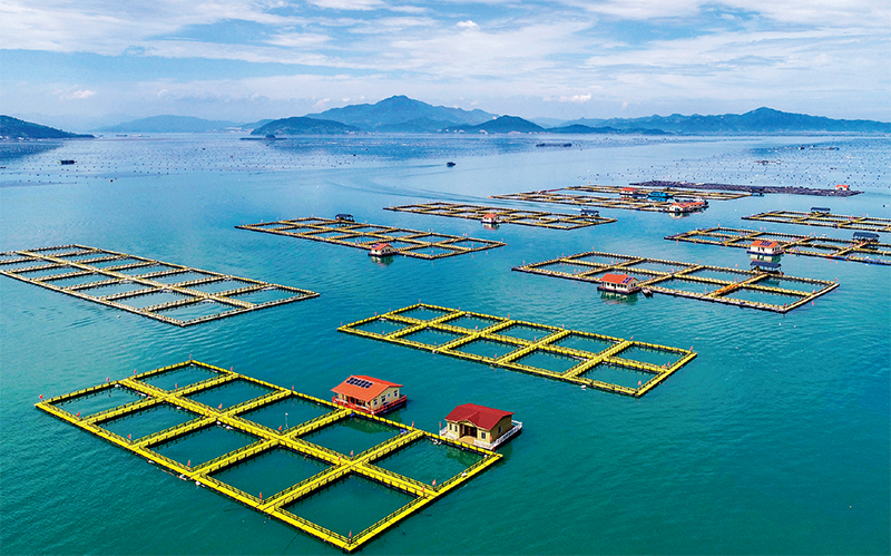 “躬耕”万顷碧波,“放牧”蔚蓝家园。在福建,越来越多的海洋牧场出现在大海中,“田园”从土地走向海洋,渔民用创新科技耕海牧渔,不断把大海变成“蓝色粮仓”。2022年福建海洋经济规模继续保持全国前列,全省海洋生产总值1.2万亿元,占地区生产总值23%。全省水产品总量862.4万吨,其中海水养殖产量548.9万吨,居全国第一;水产品人均占有量200余公斤,居全国第一;水产品出口额85亿美元,连续10年居全国首位。