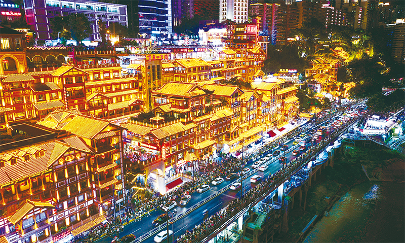 洪崖洞是重庆市重点景观工程,主要景点由吊脚楼、仿古商业街等景观组成,是兼具观光旅游、休闲度假等功能的旅游区。图为2023年8月3日重庆洪崖洞夜市街区外景。 新华社记者 刘潺/摄