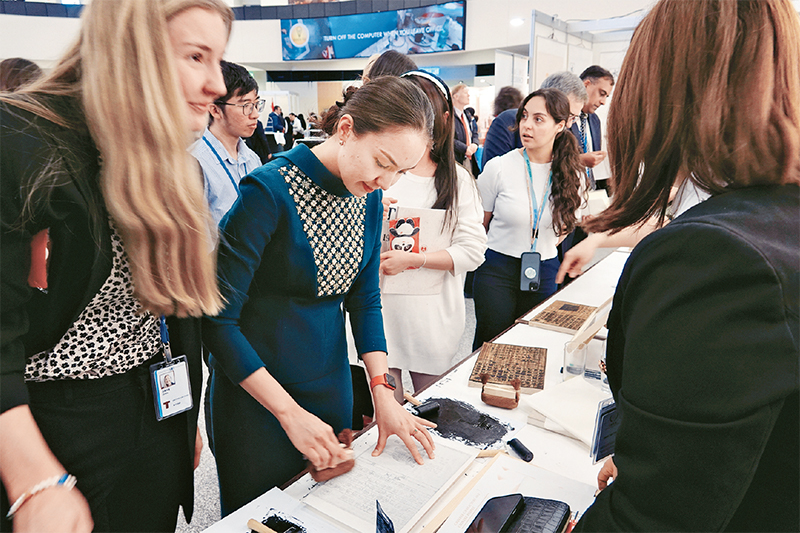 2023年5月2日,以“尼山传千载 岱海连世界——全球文明倡议的生动故事”为主题的2023维也纳联合国中文日系列活动在奥地利维也纳联合国城举办。图为参访者在活动上体验中国传统拓印。 新华社发 王宙/摄