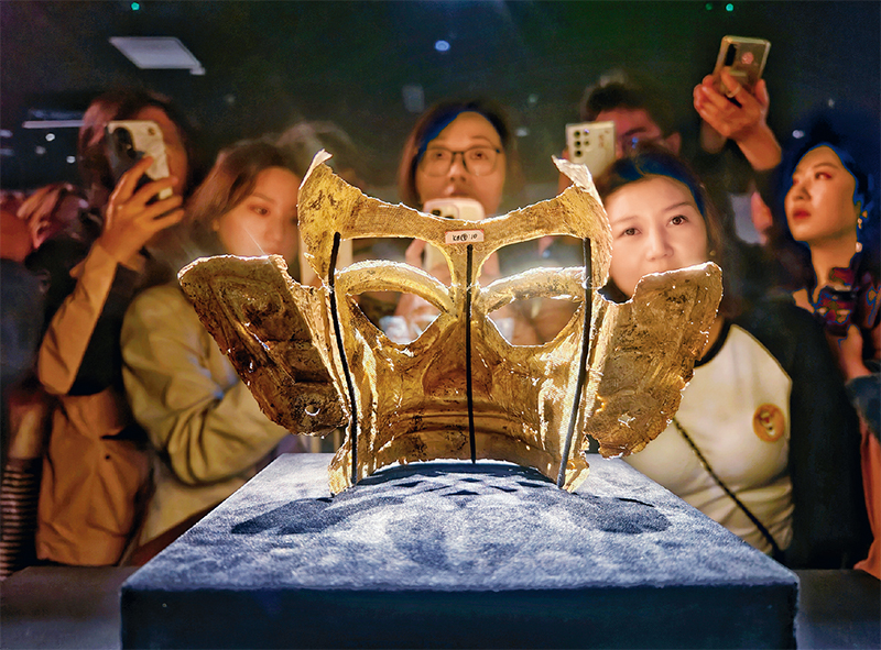 三星堆是我国西南地区迄今所知规模最大、延续时间最长、出土文物最丰富的先秦时期遗址。三星堆以“祭祀坑”出土文物为代表,展现恢宏气势,在中华文明满天星斗中熠熠夺目。图为2023年10月21日,众多游客在三星堆博物馆陈列馆参观金面具。 四川省委宣传部供图 周修建/摄
