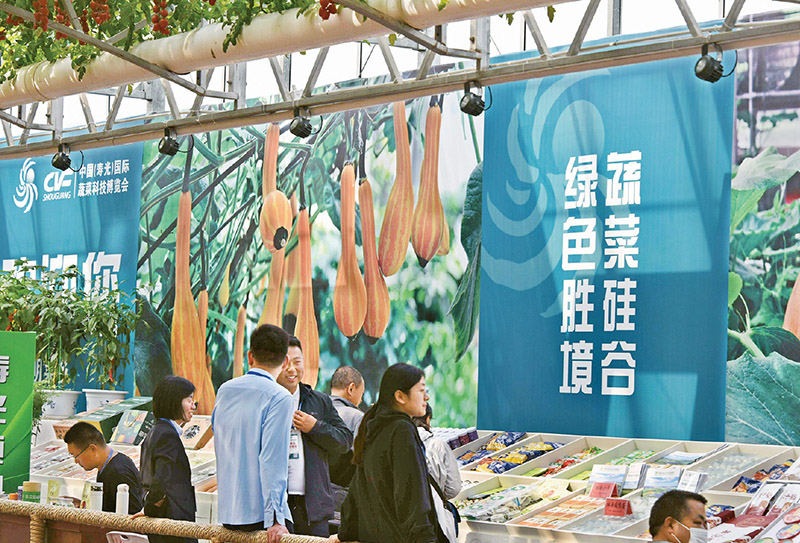 农业绿色科技是农业绿色发展的核心动力。2023年4月20日,以“绿色·科技·未来”为主题的第二十四届中国(寿光)国际蔬菜科技博览会开幕。图为开幕当日参观者在博览会上交流。 新华社记者 李紫恒/摄