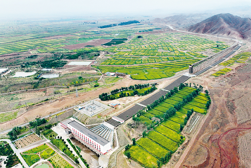 蓝天白云下,扬黄渡槽宛如龙头高高扬起,银灰色管渠在大地上仿佛一条巨龙匍匐而去,又像一棵茂盛的大树,干、支、斗、农、毛渠仿佛枝丫叶脉生发开来,所到之处,绿意盎然,生机勃勃。