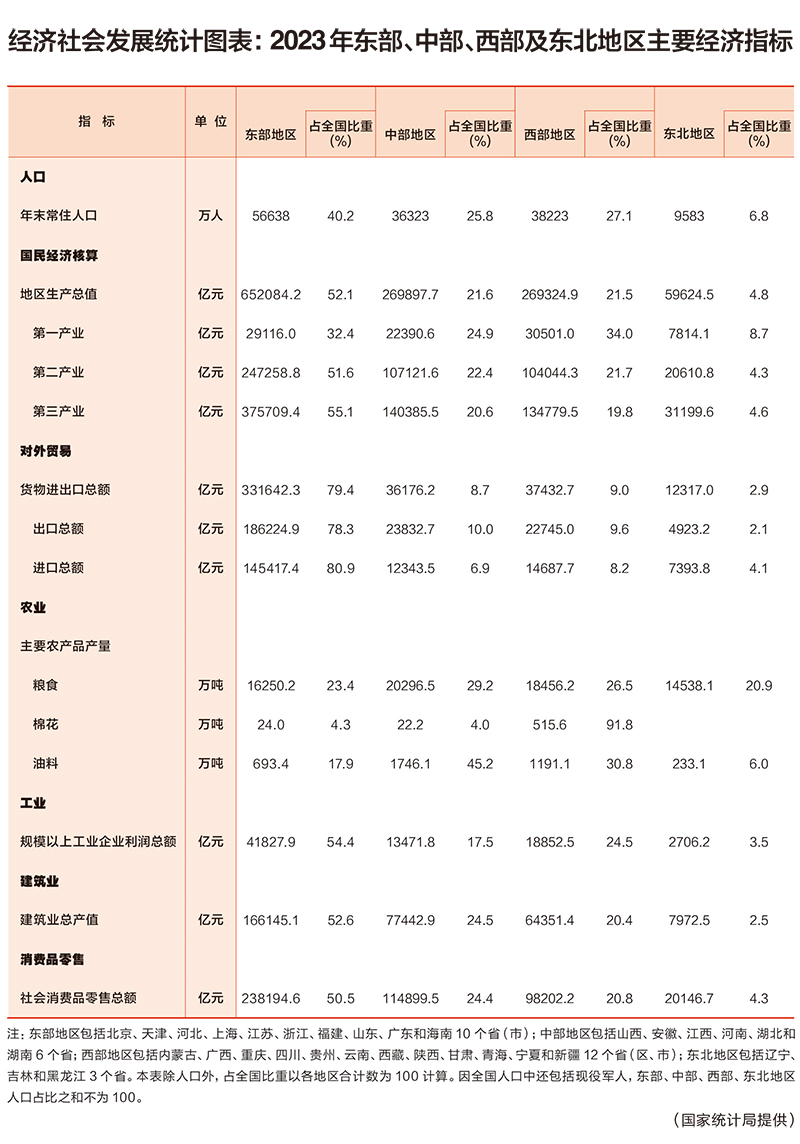 经济社会发展统计图表:2023年东部、中部、西部及东北地区主要经济指标
