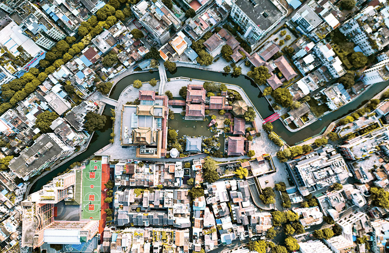 广州是国家历史文化名城,永庆坊就坐落在广州老城区恩宁路上。这条曾因年代久远而衰旧的老巷,近年来在保留历史风貌的基础上精细改造,重获新生,成为热门的“打卡地”。图为2023年6月拍摄的广州市恩宁路历史文化街区永庆坊鸟瞰图(无人机图片)。 广州市规划和自然资源局供图 陈志奕/摄