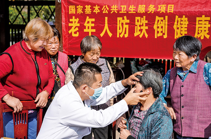 图为2024年10月10日,山东省淄博市博山区池上中心卫生院医生在池埠村长者食堂为老人义诊。 新华社记者 朱峥/摄