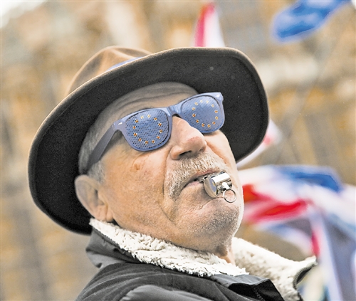 2018年12月10日,在英国伦敦,反对“脱欧”协议的民众在议会大厦外示威。