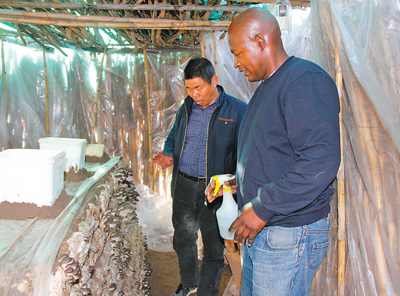 中国技术人员为蘑菇种植户讲解栽培技术。