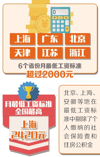与企业工资指导线不同,最低工资标准被视为一项硬性指标,是在劳动者正常劳动情况下,用人单位必须依法支付给劳动者的报酬。所谓正常劳动,是指劳动者在法定工作时间或者劳动合同约定的工作时间内从事的劳动。劳动者在国家和省规定的年休假、产假、计划生育手术假、探亲假、婚丧假等假期内休假,以及在工作时间内依法参加社会活动,视为提供正常劳动。截至2018年12月份,上海、广东、北京、天津、江苏、浙江这6个省份月最低工资标准超过2000元。上海月最低工资标准达到2420元,为全国最高。