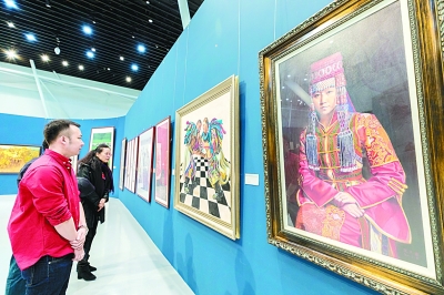1月14日,“四十如歌 砥砺同行——内蒙古庆祝改革开放四十周年书画作品展览”在内蒙古美术馆开幕。图为观众在参观展览。丁根厚摄/光明图片
