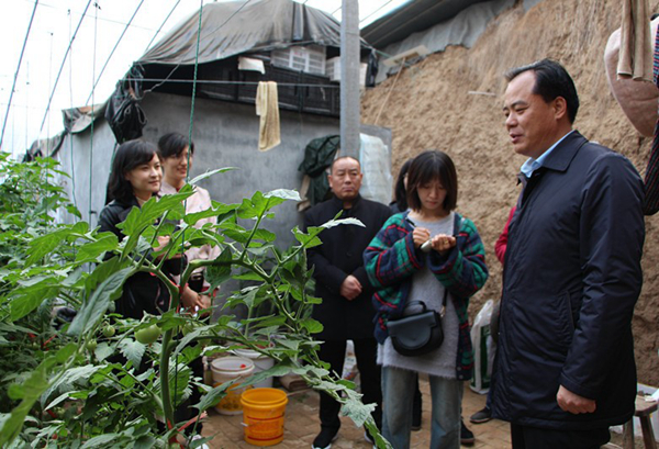 寿光市羊口镇党委书记田太卿(右一)4月11日向记者介绍盐碱地上无土化栽培西红柿情况。 张少义/摄影