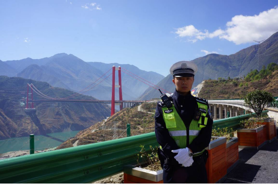 从采访中了解到,在这座大桥工作的交警十分辛苦,首先这里气候环境恶劣,常常是白天酷热难忍,夜晚雨雪交加,独特的地理位置使得常常有12级以上的横风从桥面刮过。由于人手紧张,值班的交警没有定期的工作时间,一个电话就要到岗,常常一上工作岗位就要工作半个月甚至一个月,补给都要靠大队不定期送上来。我观察到这位年轻的警官在常年风吹日晒的一线工作中,皮肤已经变得黝黑,但谈吐又显示出超出他年龄的冷静与沉稳。其次是与藏族人民的文化差异,使得他们的工作更需要耐心和爱心。黄警官告诉我们,平时工作中最大的障碍是语言不通和文化隔阂,有些当地群众法律意识不够强,常常有违规驾驶、无证驾驶等问题,交警们除了依法处理之外,还常常对他们进行推心置腹的教育,当地同胞无不感动钦佩,交通秩序也越来越好。有一个雪夜的凌晨两点,一位藏族同胞突发脑梗,家人驾车连夜前往医院。然而天气恶劣,道路结冰,高速封闭,焦急的群众找到了执勤的交警。为了救助群众的生命,执勤交警出动除冰除雪车开出了一条道路,再出动警车在大雪纷飞的道路上为急需就医的藏族同胞开出生命通道,顺利将其送到医院。正是我们可爱的新川藏人这些无怨无悔的付出和任劳任怨的工作,深深感动了当地群众,使得他们对党和政府产生无比的感激和信赖。