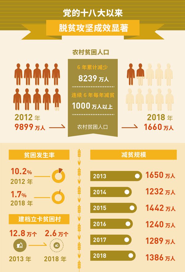 党的十八大以来,在习近平总书记身体力行、率先垂范下,我国脱贫攻坚力度之大、规模之广、成效之显著前所未有,创造了世界减贫史的奇迹。从2012年到2018年,我国现行标准下农村贫困人口累计减少8239万人,贫困发生率由10.2%降至1.7%,全国832个贫困县只剩下不到一半。现在贫困群众不愁吃、不愁穿已经普遍做到了,这意味着,中华民族历史上长期未曾解决的“吃不饱、穿不暖”问题已经彻底一去不复返了。
