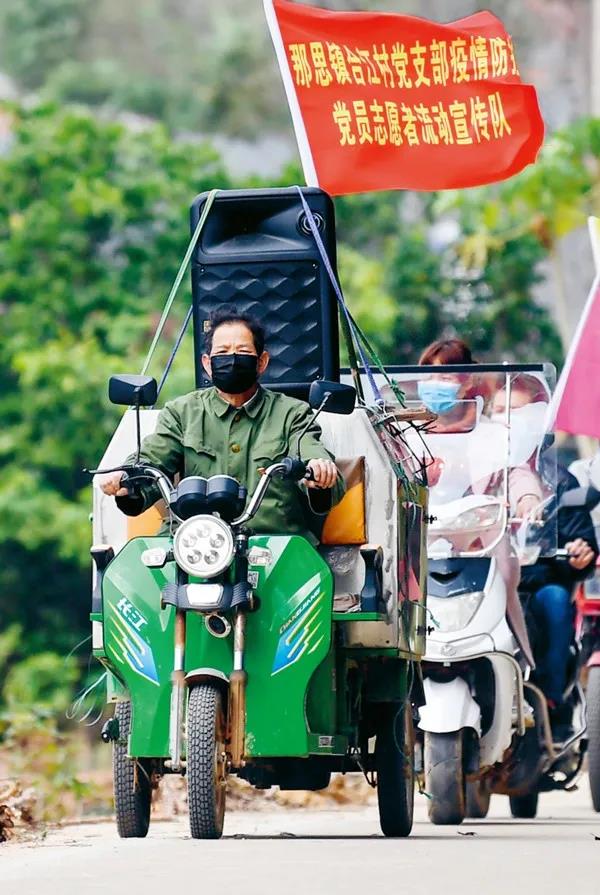 图为2月1日钦州市钦南区那思镇合江村党员吴光围(前)带领宣传队进村宣传防疫知识。 新华社记者 张爱林/摄