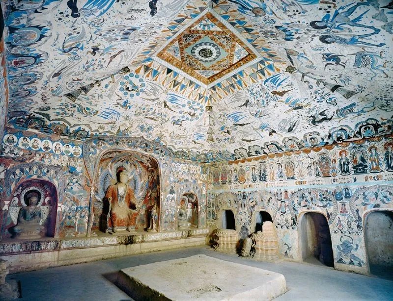莫高窟第285窟有西魏大统四年(538年)、五年(539年)的题记,是莫高窟最早有明确纪年的洞窟。这一洞窟带有明显的中原风格特征,窟顶都有飞动的彩云和各种传说中的神怪,其中还有中国的神仙,反映了外来佛教与中国本土文化的融合。图为莫高窟第285窟的洞窟形制。敦煌研究院供图