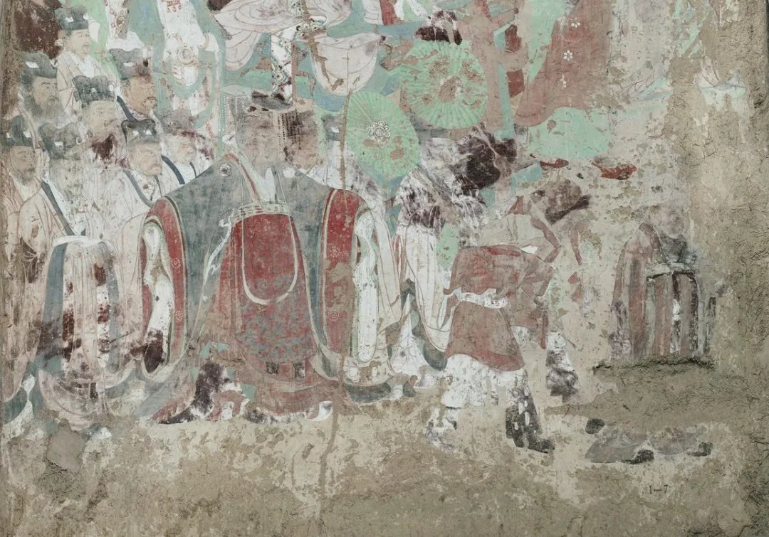 莫高窟第220窟东壁,维摩诘经变之方便品(帝王问疾),初唐,壁画具有中原风格。敦煌研究院供图。