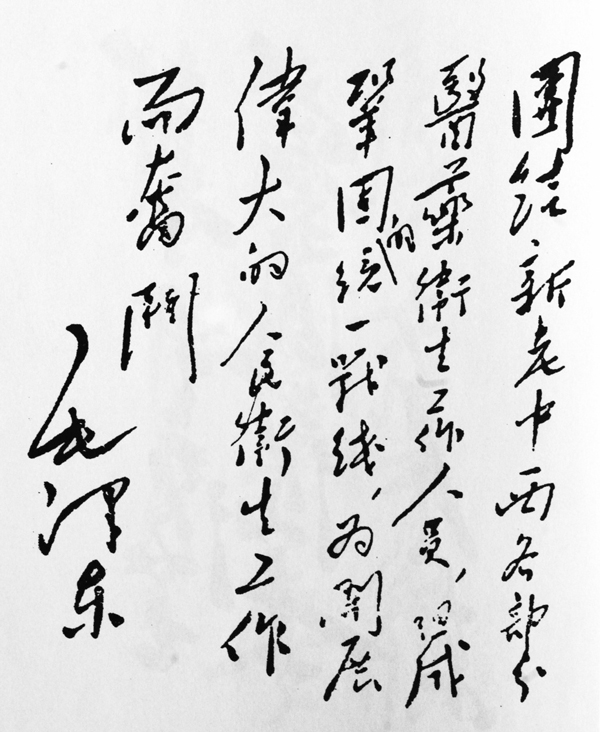 图为1950年毛泽东同志为第一届全国卫生工作会议的题词:“团结新老中西各部分医药卫生工作人员,组成巩固的统一战线,为开展伟大的人民卫生工作而奋斗。”