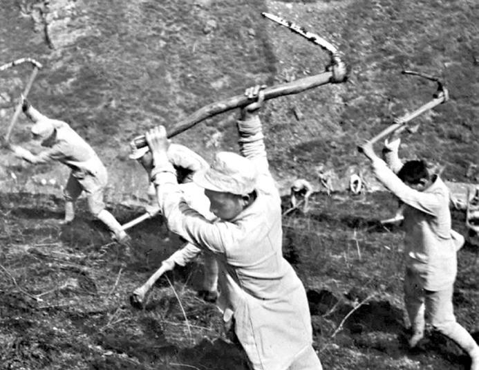 1941年前后,由于日本帝国主义的“扫荡”和国民党反动派的封锁包围及自然灾害,各抗日根据地出现了极端困难的局面。中国共产党提出“发展经济,保障供给”的方针,开展了大生产运动。图为晋察冀边区的八路军指战员在开荒生产。 新华社发