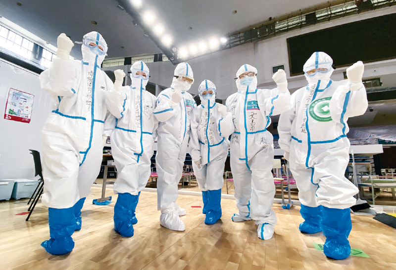 2020年3月10日,武昌方舱医院休舱。待全部患者出舱后,几名护士拍照合影,为武汉加油。湖北日报全媒记者 柯皓/摄
