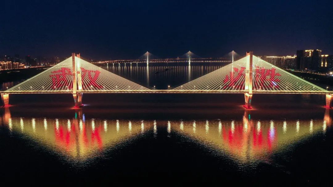 2020年3月15日晚,武汉长江二桥打出“武汉必胜”字样(无人机照片)。新华社记者 陈晔华/摄