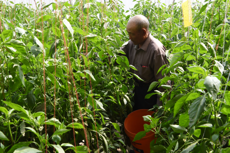 2020年4月9日,在古浪县黄花滩生态移民区富民新村,村民李应川在自家的日光温室大棚摘辣椒。新华社记者 范培珅/摄