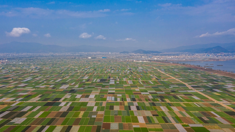 时下正值农忙时节,云南省玉溪市通海县的农作物长势喜人,山峦、湖水与农田组成了一幅美丽的田园诗画卷。新华社记者 胡超/摄