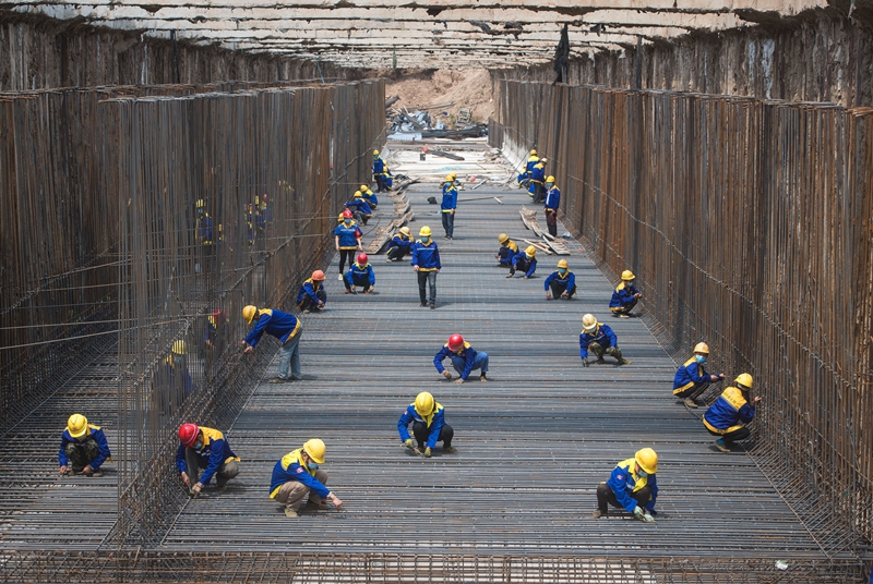 武汉:城市“收纳神器”复工复产。4月30日,来自中铁七局的建设者在武九北综合管廊工程施工现场作业。新华社记者 肖艺九/摄