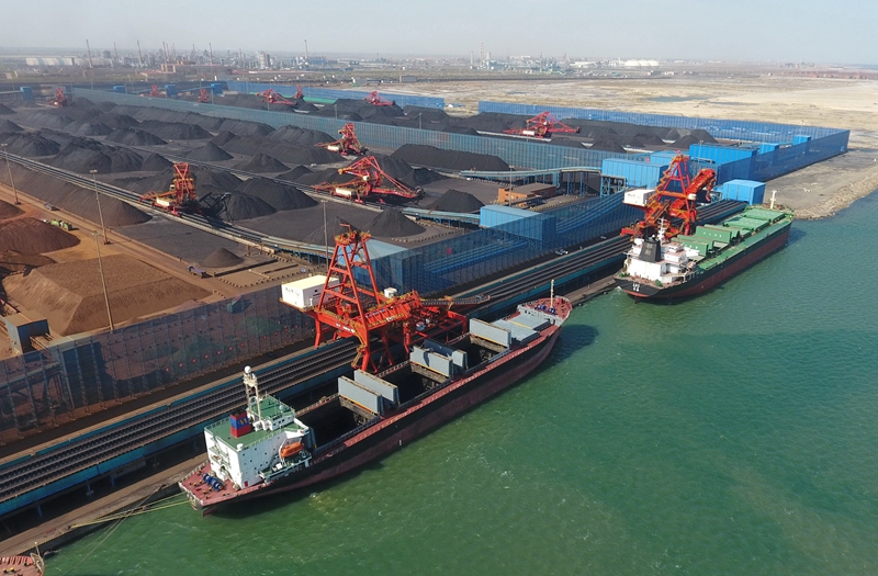 近期,随着各地复工复产提速,煤炭需求量明显回升。我国“北煤南运”重要港口唐山港开足马力全速运转,保障煤炭运输,助力各地复工复产。 图为4月23日,两艘轮船在唐山港京唐港区煤炭码头装货。新华社记者 杨世尧/摄