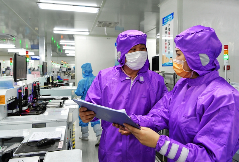 福建省厦门市思明区在积极防控疫情的基础上,为辖区内近1200家重点企业和项目建立“一对一”服务机制,为每家企业配备一名“首席服务官”,帮助协调解决企业遇到的问题,助力企业加速复工复产。图为4月17日,厦门市思明区莲前街道办事处招商中心主任林志新(右二)在厦门市一家光电科技有限公司向企业负责人了解生产经营状况。新华社记者 魏培全/摄
