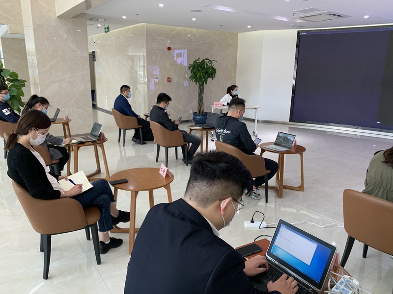 江苏徐州“云招聘”助力企业复工达产。图为4月15日,在徐州市淮海人力资源服务产业园“云招聘”现场,多家人力资源服务机构实时助力企业复工达产。新华社记者 赵久龙/摄